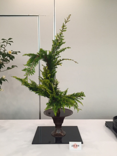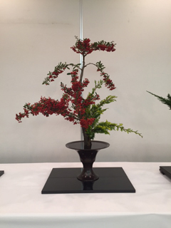 毎年新年に神社に飾る花です。桂古流は歴代家元が上座に活けることになっています。 今回は雲竜梅と目白杉でいけました。