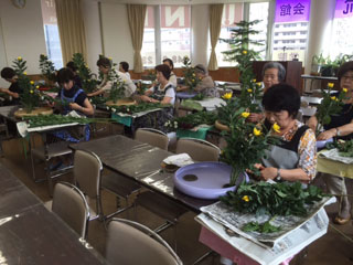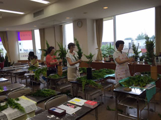 最近は枝物も入荷が難しくなりましたがとても良い孔雀ヒバが届きました。皆さん楽しみながらも真剣に活けています。
