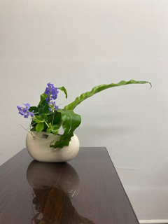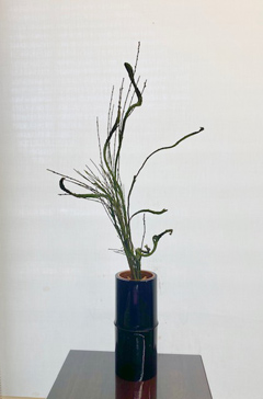 岡田芳江(中伝) 大谷渡り・枝ピー ご自身で購入した花器に活けました。 大谷渡りを上手にカーブさせて曲面を引き出しました。 枝ピーの柔らかい紫としっくり合いました。