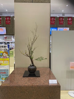 市役所の1階ロビーの花です。サンシュユと金香梅です。花留めはタコです。皆様のご多幸を願って使いました。