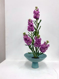 リアトリスは祖父先代華盛が好んだ花材でした。かつて正教授の試験はリアトリスと決まっていました。初心に戻って寸法を意識してお稽古します。