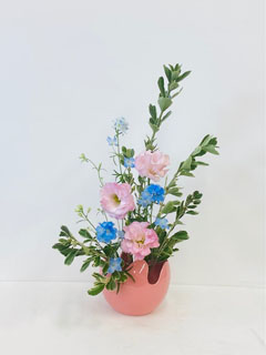 ピンクの小型花器とのコーディネートが上手くでぎした。ペールトーンの花材が全体を引き立てています。