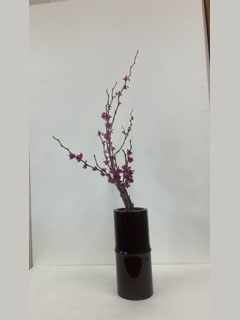 新藤華盛 桂古流三景いけ 苔梅・氷室杉・啓翁桜・カラー 山、里、水の自然の三つの景色を作品にしました。 山は厳しく、里は豊かに、水面も華として活けました。