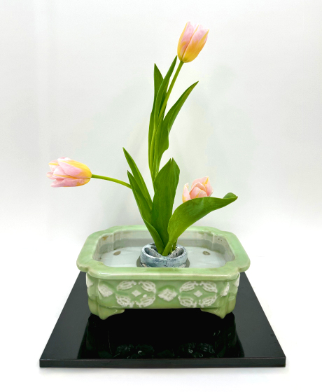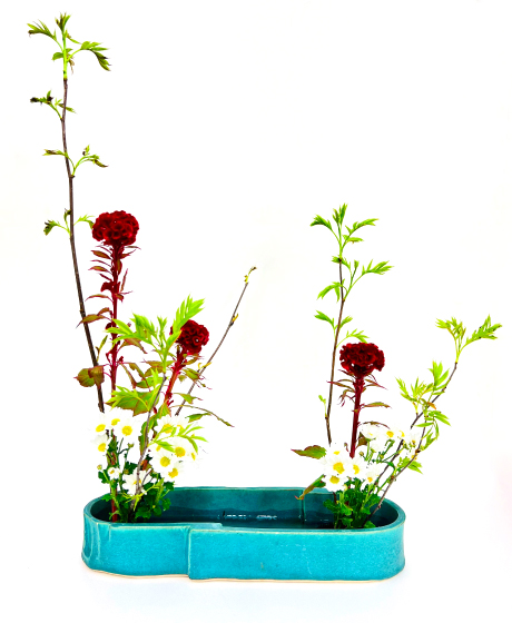 入門2年を過ぎて100杯以上お稽古された方が、盛花の基本形・株分け・コンポート・投入(壺に活ける形)が活けられるレベルになります。