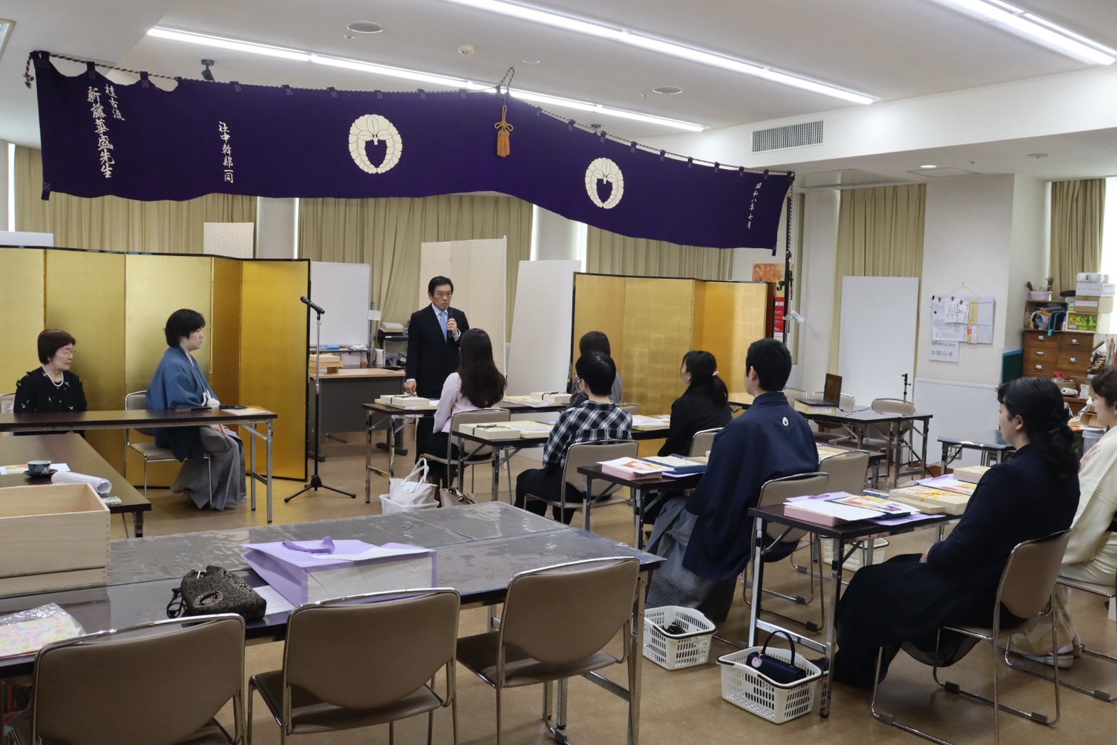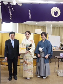 北岡華圭様は潤鳳の母君になられます。この度は師範を授与されました。上部の幕は、昭和8年に六世華盛が家元前に社中から頂いたものです。